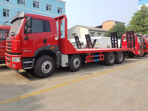 前四后八平板車配置:WP10.350E53,法士特10檔高低速,解放悍威駕駛室,13T雙后橋,300雙層大梁,1100R20鋼絲輪胎,軸距:1900+3200,3450+1350,整車尺寸:10000,11000X2500X3100,ABS,電動門窗,行車記錄儀,氣囊座椅,原廠空調.